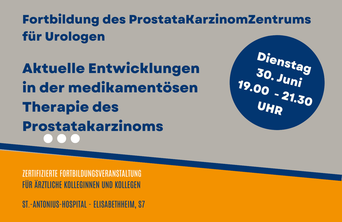 wir laden Sie herzlich zu unserer fachärztlichen Fortbildung zum Thema „Aktuelle Entwicklungen in der medikamentösen Therapie des Prostatakarzinoms“ am Dienstag, 30.06.2026 um 19.00 Uhr in das St.-Antonius-Hospital, Elisabethheim, Seminarraum 7, ein.