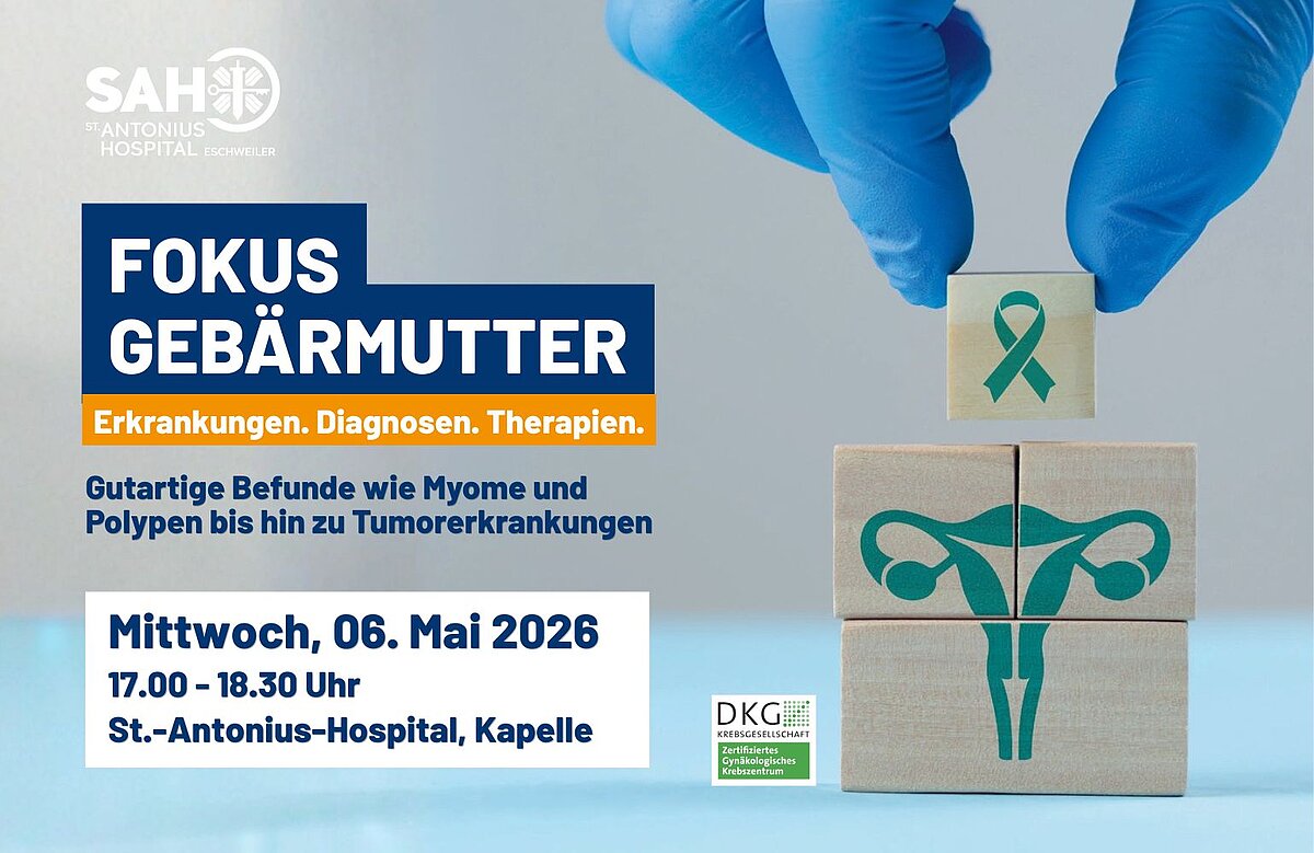 Das von der Deutschen Krebsgesellschaft zertifizierte Gynäkologische Krebszentrum am St.-Antonius-Hospital Eschweiler lädt herzlich zur Informationsveranstaltung „Fokus Gebärmutter: Erkrankungen, Diagnosen, Therapien“ am Mittwoch, 6. Mai 2026 um 17 Uhr, in die Hospitalkapelle ein.