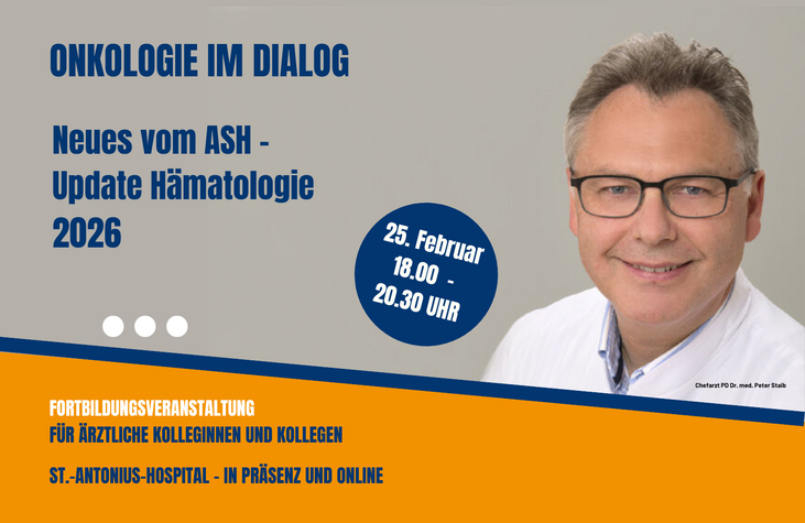 Priv.-Doz. Dr. med. Peter Staib, Chefarzt der Klinik für Hämatologie, Onkologie und Palliativmedizin, lädt am Mittwoch, 25. Februar zur Fortbildungsveranstaltung ONKOLOGIE IM DIALOG zum Thema "Neues vom ASH - Update Hämatologie 2026" ein.