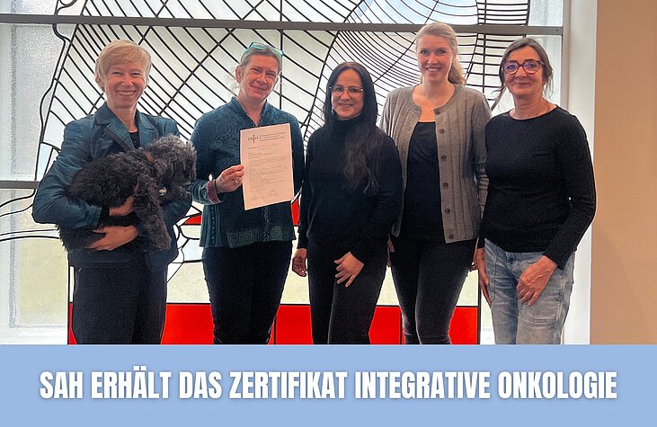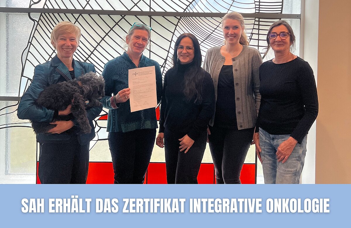 Im Rahmen der Infoveranstaltung „Komplementärmedizin, Ernährung und Sport bei Krebs“ durfte das Team der Klinik für Hämatologie, Onkologie und Palliativmedizin einen großen Erfolg feiern. Die leitende Oberärztin Dr. med. Petra Heinen sowie ihre Kolleginnen Ilona Volkmer, Michaela Kämmerling und Maria Stolz haben die zertifizierte Fortbildung „Integrative Onkologie“ der PRiO (Prävention und Integrative Onkologie, eine Arbeitsgemeinschaft der Deutschen Krebsgesellschaft) erfolgreich abgeschlossen. Daher wurde unserem SAH das „Zertifikat Integrative Onkologie“ verliehen.