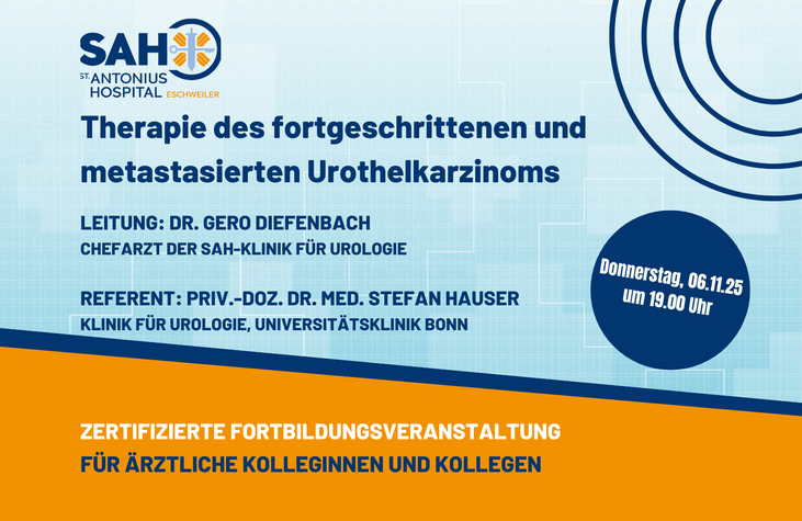 wir laden Sie herzlich zu unserer fachärztlichen Fortbildung zum Thema „Fortgeschrittenes und metastasiertes Urothelkarzinom“ am Donnerstag, 6.11.2025 um 19.00 Uhr in das St.-Antonius-Hospital, Elisabethheim, Seminarraum 7, ein.