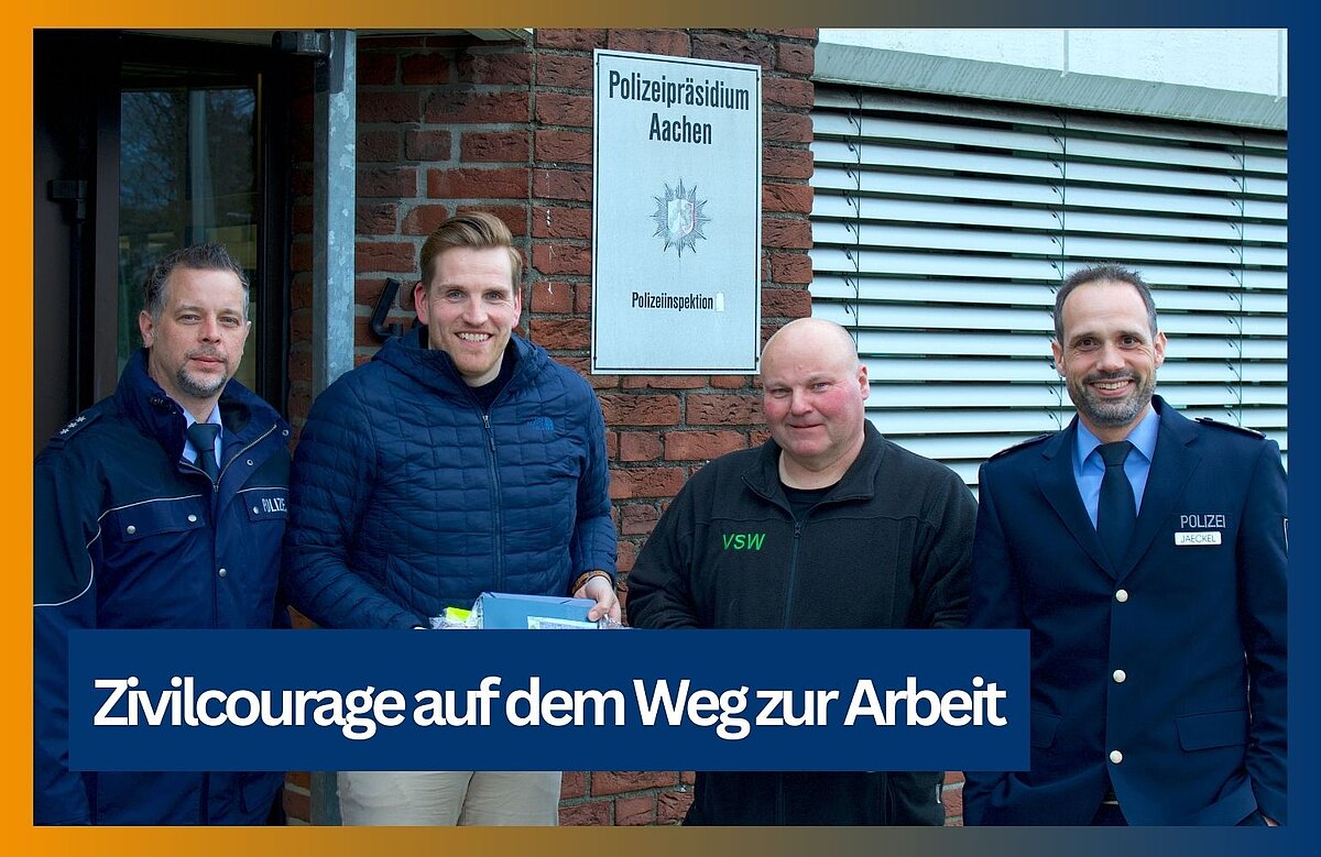 Vor wenigen Tagen wurden Benedikt Breuer und Michael Schneider daher in die Polizeiinspektion 2 in Stolberg eingeladen. Polizeidirektor Kai Jaeckel dankte ihnen bei einem persönlichen Treffen für ihren selbstlosen Einsatz. In würdigem Rahmen bei Kaffee und Kuchen überreichte er ein Dankesschreiben sowie eine Anstecknadel als Zeichen der Anerkennung.