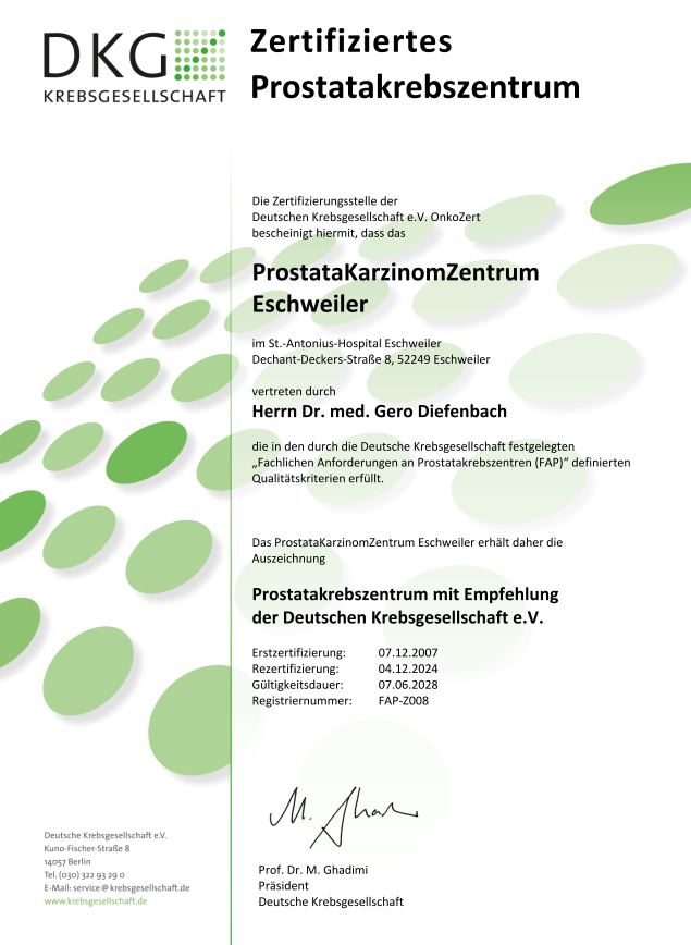 Im Jahr 2007 zertifizierte die Deutsche Krebsgesellschaft (DKG) die Klinik als eines der ersten Prostatakarzinomzentren in Deutschland. Jährliche Re-Zertifizierungen belegen eindrucksvoll höchste Prozess- und Behandlungsqualität.