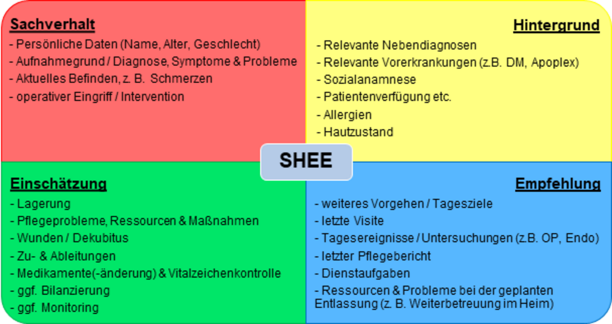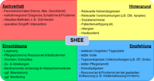 SHEE steht für Sachverhalt – Hintergrund – Einschätzung – Empfehlung und bietet ein strukturiertes Schema für mündliche Patientenübergaben. Es basiert auf dem international etablierten SBAR-Schema(1), wurde jedoch ins Deutsche übersetzt und an unsere klinische Praxis angepasst.