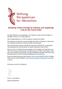 Die Stiftung Perspektive für Menschen bietet eine breite Themenpalette an Online-Vorträgen rund um das Thema Krebs für Patienten und Angehörige. Die Teilnahme ist kostenlos.