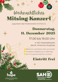 Weihnachtliches Mitsing-Konzert zugunsten des Fördervereins H.O.P.E e.V. Donnerstag, 11. Dezember 2025 17.00 bis 19.00 Uhr in der Hospitalkapelle des St.-Antonius-Hospitals Bekannte und beliebte…